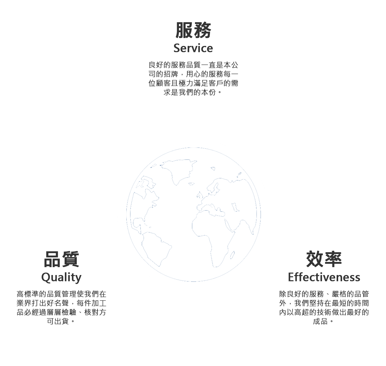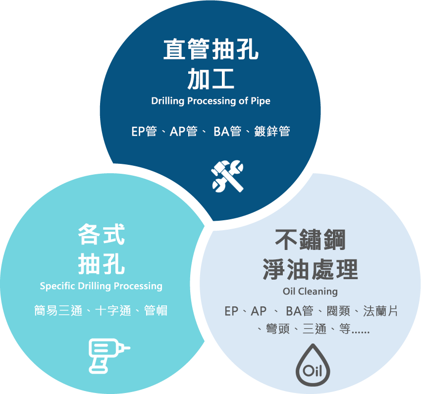 本公司成立至今始終秉持著「誠信」為各位客戶服務,並極力滿足顧客的需求。為使產品更符合市場需要及創造出高附加價值,公司更為產品加工技術研究開發設立專屬技術研發團隊負責,持續精進技術並提升生產效率;無論是一管多通或其另件抽孔加工均已有重大的突破及經驗值得累積。